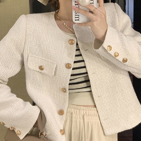 이 트위드 자켓의 가장 큰 매력은 바로 그것! 고품질의 소재와 섬세하게 배치된 버튼 디자인이 만나 완벽한 조화를 이루고 있답니다. 입었을 때의 핏도 정말 예쁘고, 어디서든 뽐낼 수 있는 스타일리시함을 더해줘요~