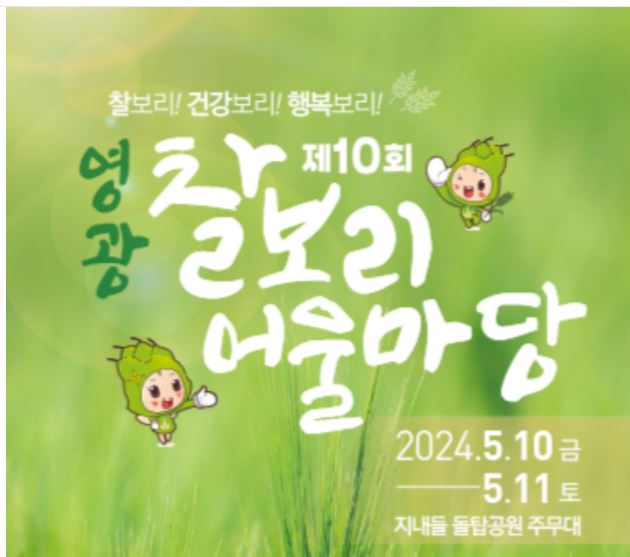전남영광군은 '찰보리! 건강보리! 행목보리! 주제로 5월 10일부터 11일까지 돌탑공원에서 제10회 영광 찰보리 어울마당을 개최합니다.